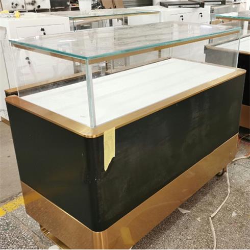 片尺寸價格說明定做服務(wù)。該款展柜為不銹鋼框架結(jié)構(gòu)和木結(jié)構(gòu)相組合,金色部分為拉絲不銹鋼經(jīng)刨槽折彎、無縫焊接和電鍍無指紋處理等多道工序精制而成,黑色部分為麻面黑色啞光烤漆飾面。