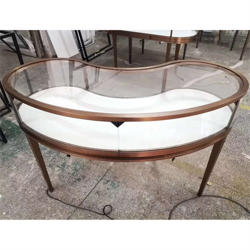 高端不銹鋼珠寶展柜_拉絲鈦金弧形不銹鋼玻璃展示柜