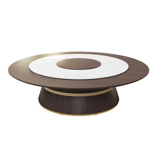 酒店包房實(shí)木電動(dòng)大圓桌帶轉(zhuǎn)盤(pán)自動(dòng)旋轉(zhuǎn)餐桌臺(tái)面是實(shí)木桌面與巖板轉(zhuǎn)盤(pán)組成,