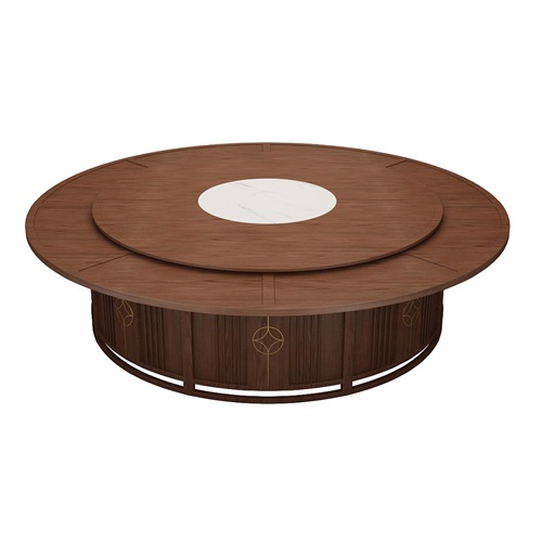 。這款宴會(huì)餐廳新中式實(shí)木20人轉(zhuǎn)盤(pán)電動(dòng)餐桌是由經(jīng)典的胡桃色實(shí)木與白色大理石搭配。轉(zhuǎn)盤(pán)是白色的大理石,桌面是胡桃色的實(shí)木,這樣看起來(lái)電動(dòng)餐桌上下更加呼應(yīng),底座采用很前衛(wèi)的豎行格柵,并且在桌面可以電動(dòng)遙控旋轉(zhuǎn),讓電動(dòng)餐桌功能更加豐富,就餐者有更好的就餐體驗(yàn)。