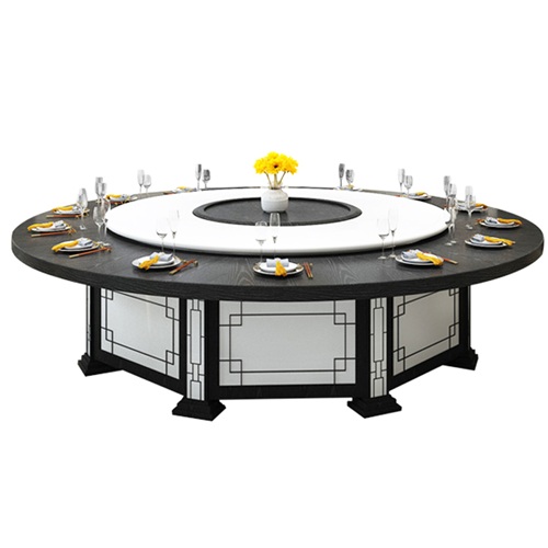 酒店新中式自動旋轉(zhuǎn)15人20人大圓桌電動餐桌采用的是經(jīng)典黑白顏色的搭配,以傳統(tǒng)的窗花花格作為設(shè)計元素,體現(xiàn)中國傳統(tǒng)文化的傳承,