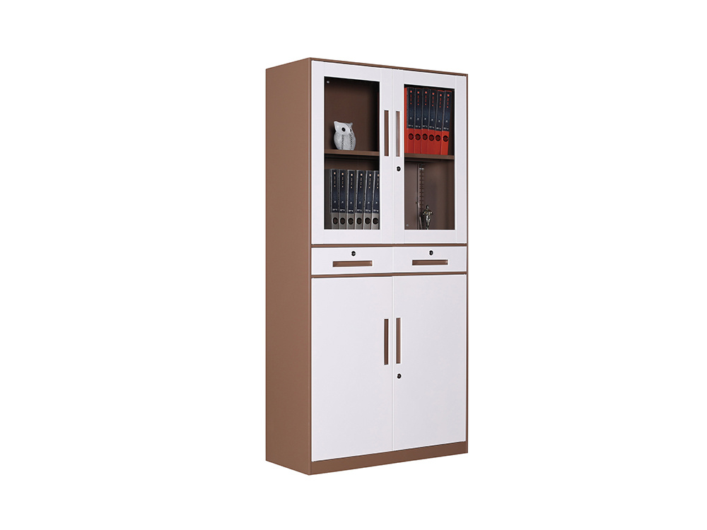 ● 一體結(jié)構(gòu)設(shè)置,上部玻璃對開門,內(nèi)置1層層板可調(diào)高度,內(nèi)置物品可視,便于拿取,中間2個(gè)抽屜,下部對開鐵門、門內(nèi)一格板,設(shè)置有拉手和鎖。