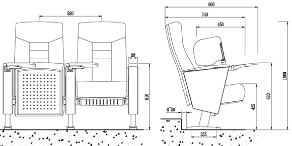 2.座椅基本中心距為580±1.0mm,座包打開側(cè)深720±1.0mm,寫字板打開側(cè)深860±1.0mmm,基本椅高為1000±1.0mm。最小排距:900mm。