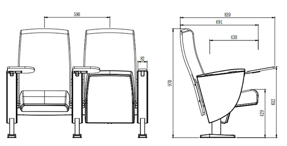 2.座椅基本中心距為580±10mm,座包打開側(cè)深691±10mm,寫字板打開側(cè)深839±10mmm,基本椅高為970±10mm。最小排距:900mm。通過相關(guān)家具產(chǎn)品質(zhì)量檢驗中心QB/T2602-2013《影劇院公共座椅》的相關(guān)檢測依據(jù),甲醛釋放量≤0.120mg/m³h;抗引燃特性符合GB17927.1-2011中的要求。