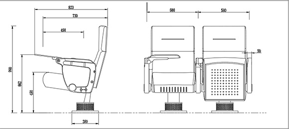 1.座寬(扶手中對(duì)中):580mm,座椅總高:990±10mm,座高:450±10mm。座椅深度:823±10mm,扶手高662±10mm:最小排距:900mm。