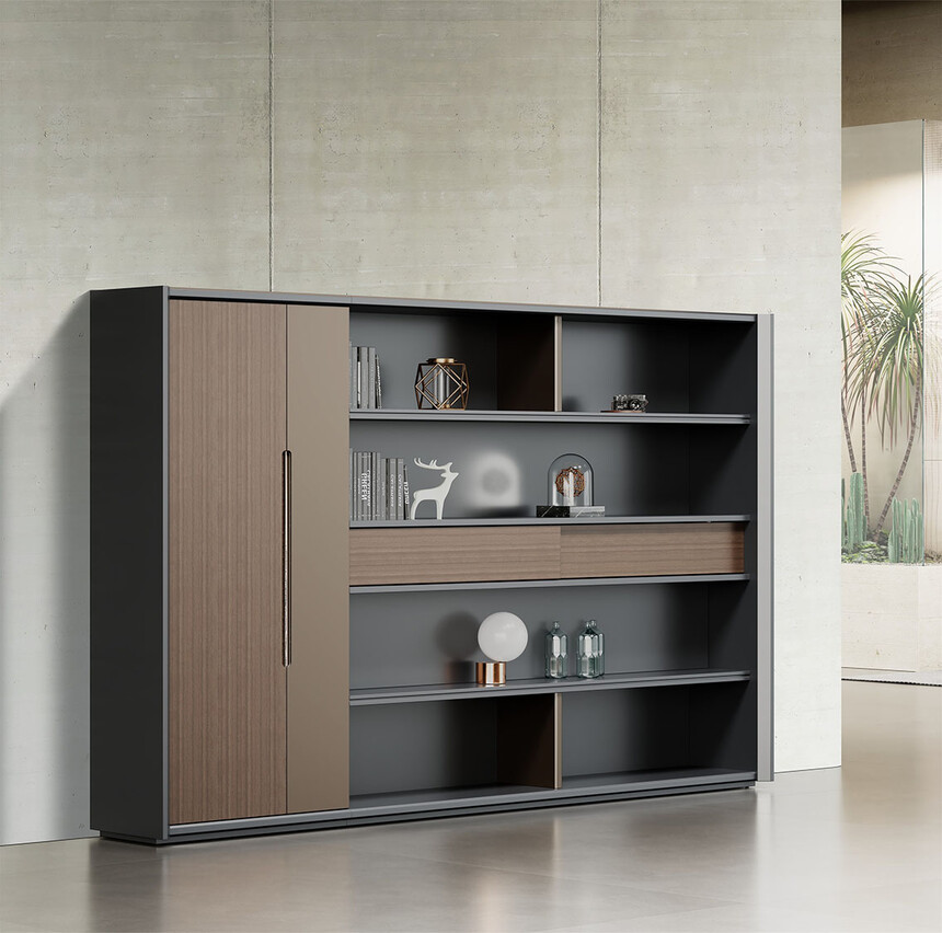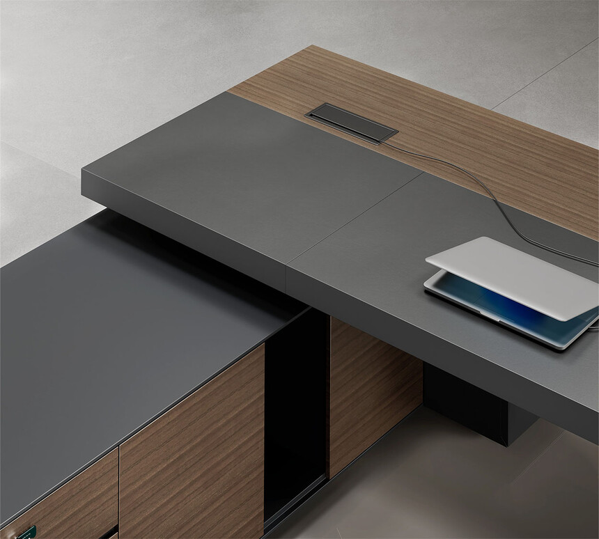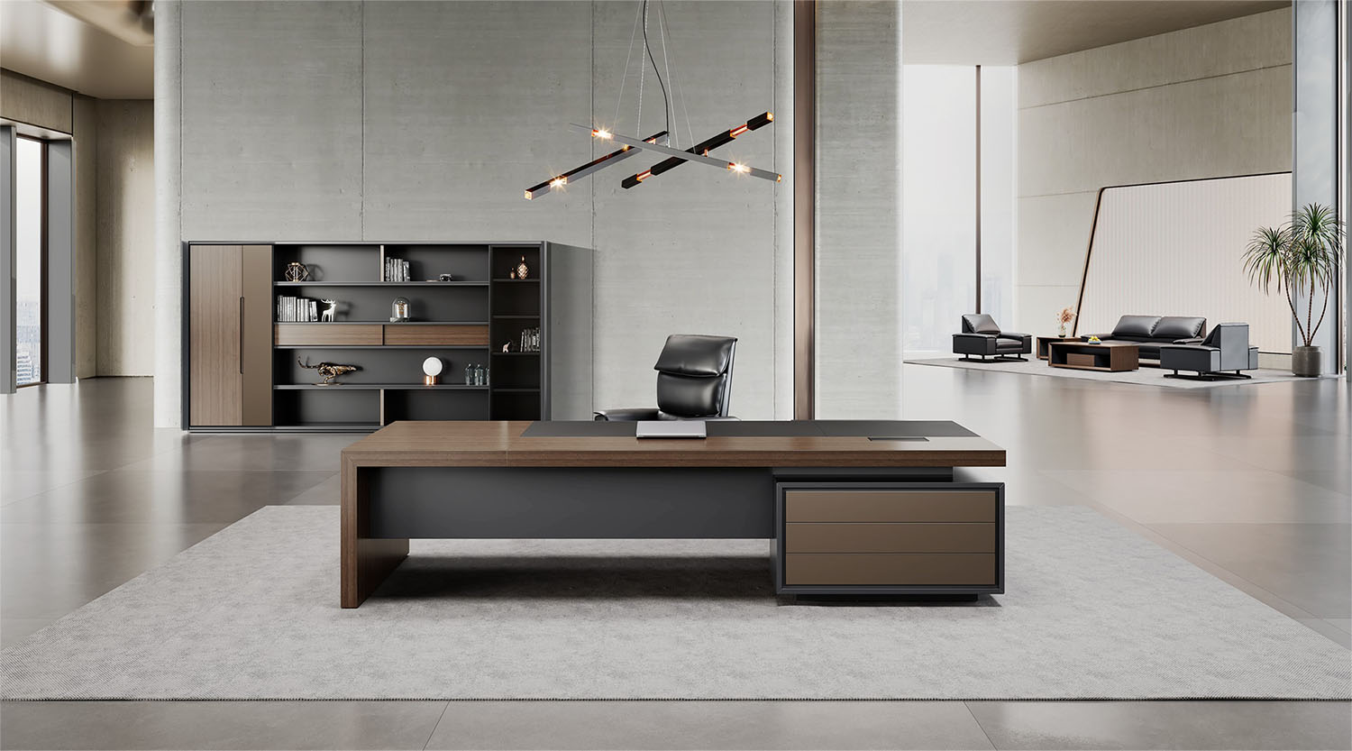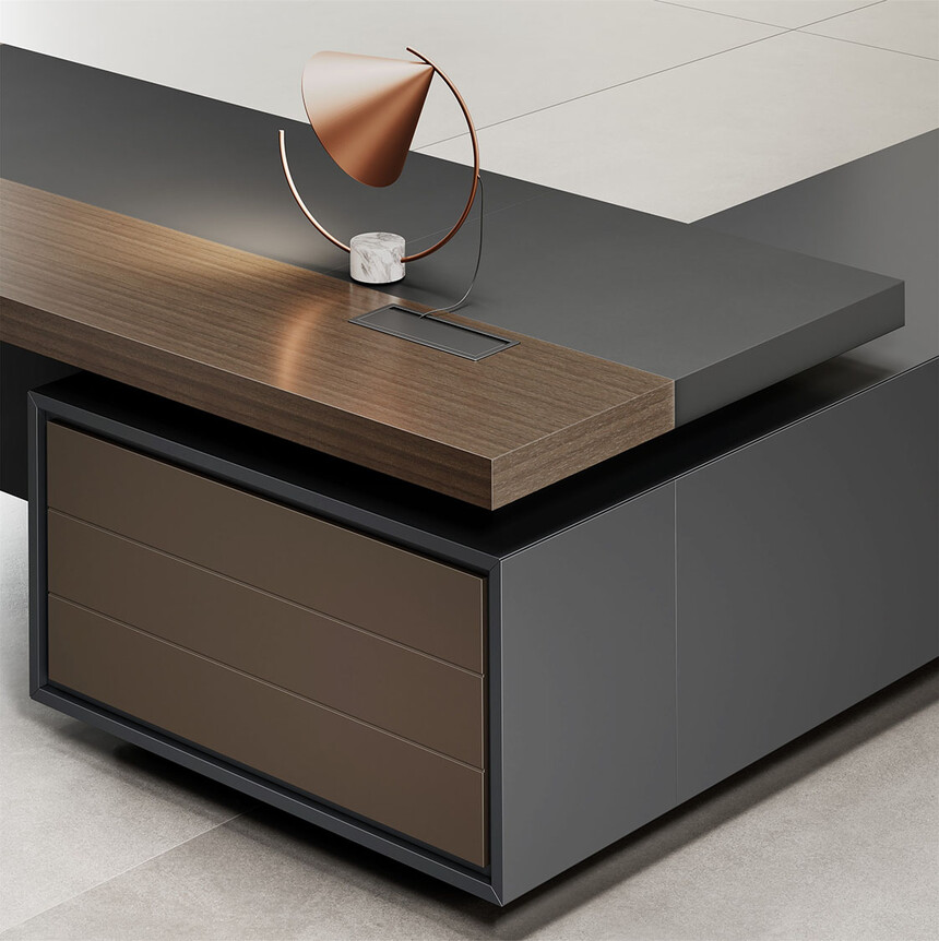 明哲系列辦公家具,采用直紋胡桃和星空灰實(shí)色漆元素,高檔實(shí)木質(zhì)感飾面,深邃飽滿,紋理清晰,內(nèi)蘊(yùn)深厚。搭配簡約端正的造型設(shè)計(jì),臺(tái)腳的斜切裝置,還有產(chǎn)品的布局變化,錯(cuò)落有致,承前啟后,展現(xiàn)極致簡潔和視覺效果的完美詮釋。低調(diào)又不失時(shí)尚,穩(wěn)重又不失靈動(dòng),既營造現(xiàn)代時(shí)尚的情緒,還給當(dāng)今辦公環(huán)境注入明亮、輕松的舒適感。